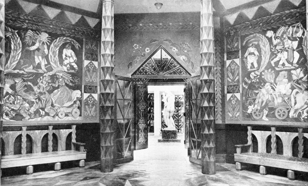 Styl ten jednocześnie sprzeciwiał się dekoracyjnej secesji (art nouveau) – jej brakowi formy, dyscypliny przestrzennej i chaosowi. Nazwa stylu wywodzi się z języka francuskiego: art – sztuka, décoratif – dekoracyjny i bezpośrednio od nazwy paryskiej Exposition Internationale des Arts Décoratifs et Industriels Modernes (Międzynarodowa Wystawa Sztuk Dekoracyjnych i Przemysłu Współczesnego) z 1925 r. Styl art déco charakteryzował się klasycyzującym zgeometryzowaniem. Wzory czerpał z europejskiego klasycyzmu, ale także narodowej tradycji i rodzimego folkloru.